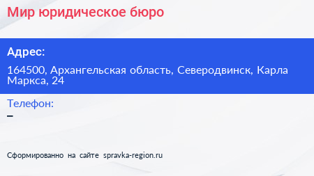 Мир, юридическое бюро по адресу 164500, Архангельская область, Северодвинск, Карла Маркса, 24 в дальнейшем Организация, размещена в следующих категориях: