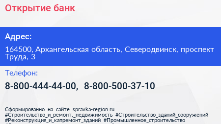 Открытие, банк по адресу 164500, Архангельская область, Северодвинск, проспект Труда, 3 в дальнейшем Организация, размещена в следующих категориях: