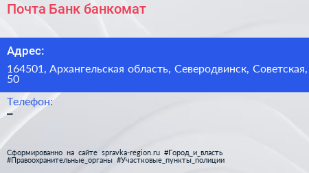 Почта Банк, банкомат по адресу 164501, Архангельская область, Северодвинск, Советская, 50 в дальнейшем Организация, размещена в следующих категориях: