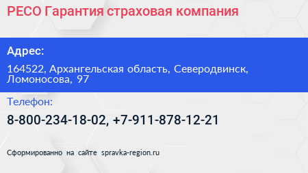 РЕСО-Гарантия, страховая компания по адресу 164522, Архангельская область, Северодвинск, Ломоносова, 97 в дальнейшем Организация, размещена в следующих категориях: