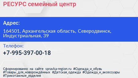 РЕСУРС, семейный центр по адресу 164501, Архангельская область, Северодвинск, Индустриальная, 39 в дальнейшем Организация, размещена в следующих категориях: