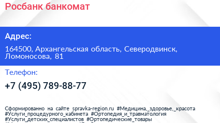 Росбанк, банкомат по адресу 164500, Архангельская область, Северодвинск, Ломоносова, 81 в дальнейшем Организация, размещена в следующих категориях: