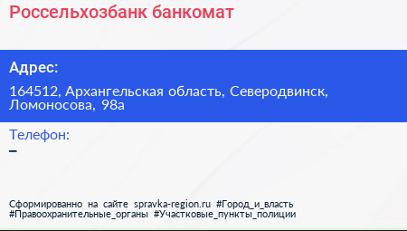 Россельхозбанк, банкомат по адресу 164512, Архангельская область, Северодвинск, Ломоносова, 98а в дальнейшем Организация, размещена в следующих категориях: