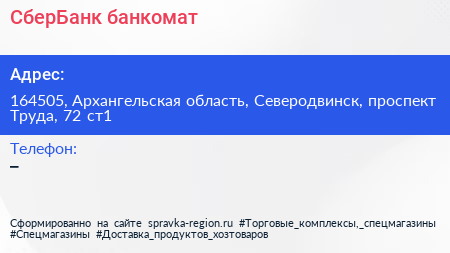 СберБанк, банкомат по адресу 164505, Архангельская область, Северодвинск, проспект Труда, 72 ст1 в дальнейшем Организация, размещена в следующих категориях: