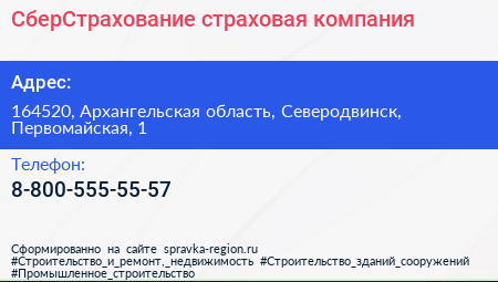 СберСтрахование, страховая компания по адресу 164520, Архангельская область, Северодвинск, Первомайская, 1 в дальнейшем Организация, размещена в следующих категориях: