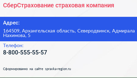 СберСтрахование, страховая компания по адресу 164509, Архангельская область, Северодвинск, Адмирала Нахимова, 5 в дальнейшем Организация, размещена в следующих категориях: