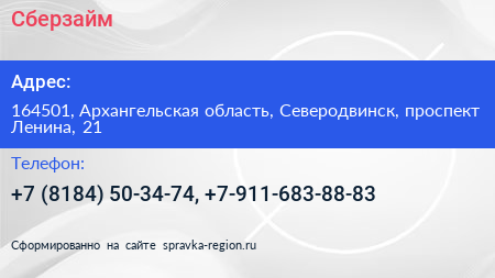 Сберзайм по адресу 164501, Архангельская область, Северодвинск, проспект Ленина, 21 в дальнейшем Организация, размещена в следующих категориях: