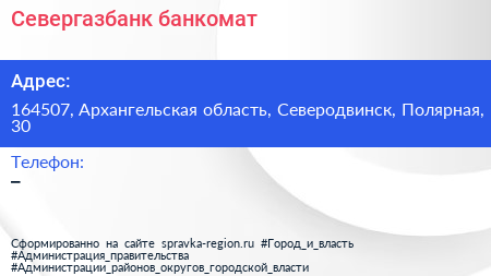 Севергазбанк, банкомат по адресу 164507, Архангельская область, Северодвинск, Полярная, 30 в дальнейшем Организация, размещена в следующих категориях: