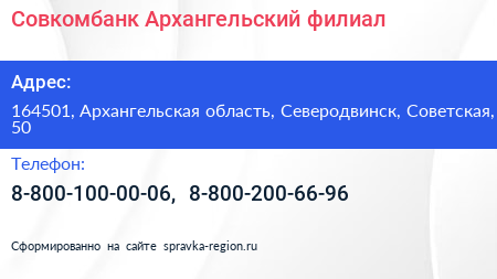 Совкомбанк, Архангельский филиал по адресу 164501, Архангельская область, Северодвинск, Советская, 50 в дальнейшем Организация, размещена в следующих категориях:
