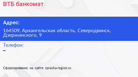 ВТБ, банкомат по адресу 164509, Архангельская область, Северодвинск, Дзержинского, 9 в дальнейшем Организация, размещена в следующих категориях: