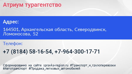 Атриум, турагентство по адресу 164501, Архангельская область, Северодвинск, Ломоносова, 52 в дальнейшем Организация, размещена в следующих категориях: