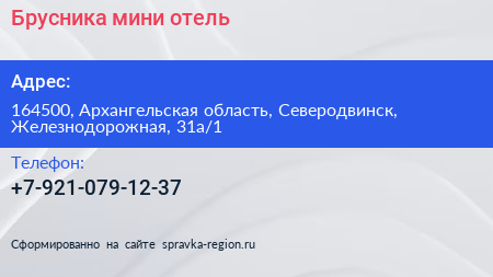 Брусника, мини-отель по адресу 164500, Архангельская область, Северодвинск, Железнодорожная, 31а/1 в дальнейшем Организация, размещена в следующих категориях: