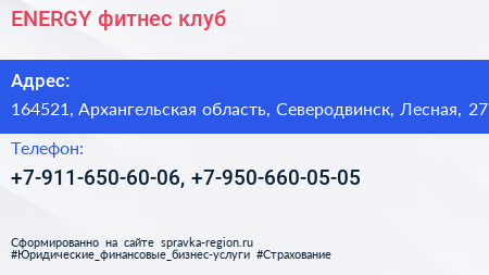 ENERGY, фитнес-клуб по адресу 164521, Архангельская область, Северодвинск, Лесная, 27 в дальнейшем Организация, размещена в следующих категориях: