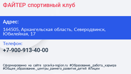 ФАЙТЕР, спортивный клуб по адресу 164505, Архангельская область, Северодвинск, Юбилейная, 17 в дальнейшем Организация, размещена в следующих категориях: