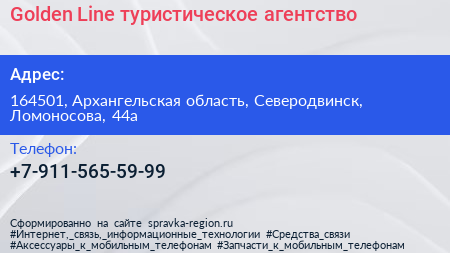 Golden Line, туристическое агентство по адресу 164501, Архангельская область, Северодвинск, Ломоносова, 44а в дальнейшем Организация, размещена в следующих категориях: