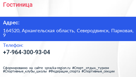 Гостиница по адресу 164520, Архангельская область, Северодвинск, Парковая, 9 в дальнейшем Организация, размещена в следующих категориях:
