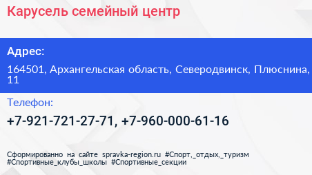 Карусель, семейный центр по адресу 164501, Архангельская область, Северодвинск, Плюснина, 11 в дальнейшем Организация, размещена в следующих категориях: