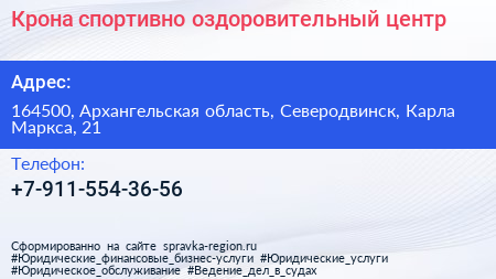 Крона, спортивно-оздоровительный центр по адресу 164500, Архангельская область, Северодвинск, Карла Маркса, 21 в дальнейшем Организация, размещена в следующих категориях: