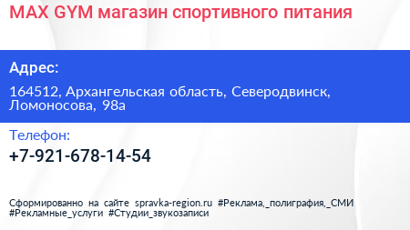 MAX GYM, магазин спортивного питания по адресу 164512, Архангельская область, Северодвинск, Ломоносова, 98а в дальнейшем Организация, размещена в следующих категориях: