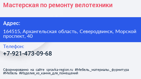Мастерская по ремонту велотехники по адресу 164515, Архангельская область, Северодвинск, Морской проспект, 40 в дальнейшем Организация, размещена в следующих категориях: