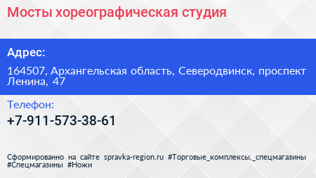 Мосты, хореографическая студия по адресу 164507, Архангельская область, Северодвинск, проспект Ленина, 47 в дальнейшем Организация, размещена в следующих категориях: