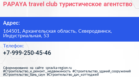 PAPAYA travel club, туристическое агентство по адресу 164501, Архангельская область, Северодвинск, Индустриальная, 53 в дальнейшем Организация, размещена в следующих категориях: