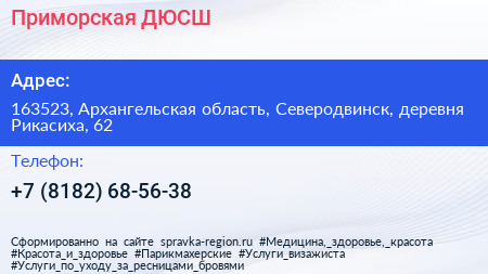 Приморская ДЮСШ по адресу 163523, Архангельская область, Северодвинск, деревня Рикасиха, 62 в дальнейшем Организация, размещена в следующих категориях: