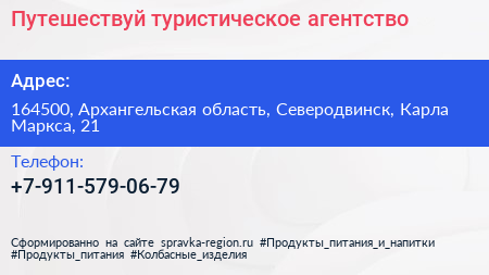 Путешествуй, туристическое агентство по адресу 164500, Архангельская область, Северодвинск, Карла Маркса, 21 в дальнейшем Организация, размещена в следующих категориях: