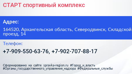 СТАРТ, спортивный комплекс по адресу 164520, Архангельская область, Северодвинск, Складской проезд, 14 в дальнейшем Организация, размещена в следующих категориях: