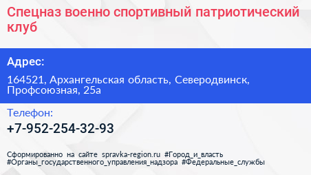 Спецназ, военно-спортивный патриотический клуб по адресу 164521, Архангельская область, Северодвинск, Профсоюзная, 25а в дальнейшем Организация, размещена в следующих категориях: