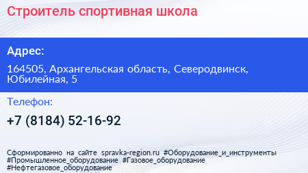 Строитель, спортивная школа по адресу 164505, Архангельская область, Северодвинск, Юбилейная, 5 в дальнейшем Организация, размещена в следующих категориях: