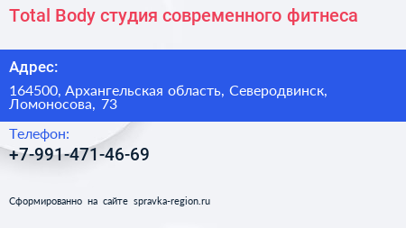 Total Body, студия современного фитнеса по адресу 164500, Архангельская область, Северодвинск, Ломоносова, 73 в дальнейшем Организация, размещена в следующих категориях: