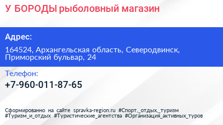 У БОРОДЫ, рыболовный магазин по адресу 164524, Архангельская область, Северодвинск, Приморский бульвар, 24 в дальнейшем Организация, размещена в следующих категориях: