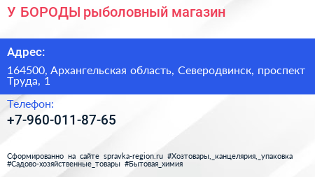 У БОРОДЫ, рыболовный магазин по адресу 164500, Архангельская область, Северодвинск, проспект Труда, 1 в дальнейшем Организация, размещена в следующих категориях: