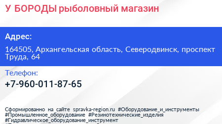 У БОРОДЫ, рыболовный магазин по адресу 164505, Архангельская область, Северодвинск, проспект Труда, 64 в дальнейшем Организация, размещена в следующих категориях: