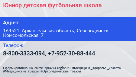 Юниор, детская футбольная школа по адресу 164521, Архангельская область, Северодвинск, Комсомольская, 7 в дальнейшем Организация, размещена в следующих категориях: