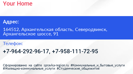 Your Home по адресу 164512, Архангельская область, Северодвинск, Архангельское шоссе, 91 в дальнейшем Организация, размещена в следующих категориях: