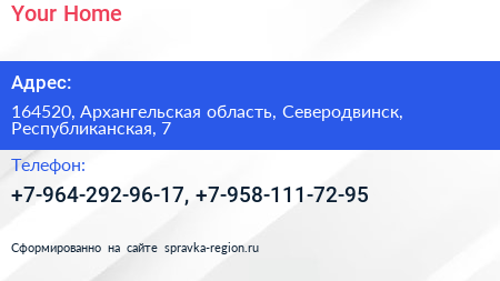 Your Home по адресу 164520, Архангельская область, Северодвинск, Республиканская, 7 в дальнейшем Организация, размещена в следующих категориях: