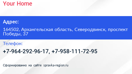 Your Home по адресу 164502, Архангельская область, Северодвинск, проспект Победы, 37 в дальнейшем Организация, размещена в следующих категориях: