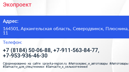 Экопроект по адресу 164501, Архангельская область, Северодвинск, Плюснина, 11 в дальнейшем Организация, размещена в следующих категориях: