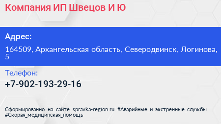Компания, ИП Швецов И.Ю. по адресу 164509, Архангельская область, Северодвинск, Логинова, 5 в дальнейшем Организация, размещена в следующих категориях:
