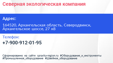 Северная экологическая компания по адресу 164520, Архангельская область, Северодвинск, Архангельское шоссе, 27 к8 в дальнейшем Организация, размещена в следующих категориях: