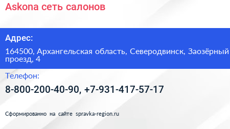 Askona, сеть салонов по адресу 164500, Архангельская область, Северодвинск, Заозёрный проезд, 4 в дальнейшем Организация, размещена в следующих категориях: