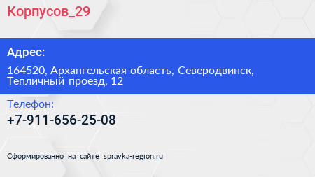 Корпусов_29 по адресу 164520, Архангельская область, Северодвинск, Тепличный проезд, 12 в дальнейшем Организация, размещена в следующих категориях: