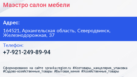 Маэстро, салон мебели по адресу 164521, Архангельская область, Северодвинск, Железнодорожная, 37 в дальнейшем Организация, размещена в следующих категориях: