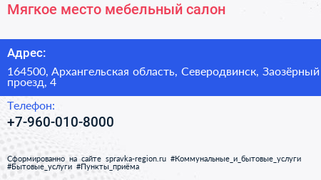 Мягкое место, мебельный салон по адресу 164500, Архангельская область, Северодвинск, Заозёрный проезд, 4 в дальнейшем Организация, размещена в следующих категориях: