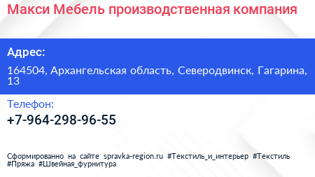 Макси Мебель, производственная компания по адресу 164504, Архангельская область, Северодвинск, Гагарина, 13 в дальнейшем Организация, размещена в следующих категориях: