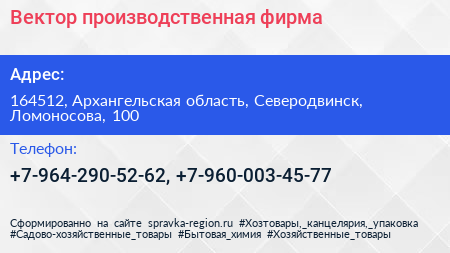 Вектор, производственная фирма по адресу 164512, Архангельская область, Северодвинск, Ломоносова, 100 в дальнейшем Организация, размещена в следующих категориях: