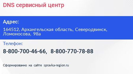 DNS, сервисный центр по адресу 164512, Архангельская область, Северодвинск, Ломоносова, 98а в дальнейшем Организация, размещена в следующих категориях: