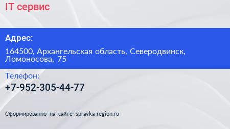 IT-сервис по адресу 164500, Архангельская область, Северодвинск, Ломоносова, 75 в дальнейшем Организация, размещена в следующих категориях: